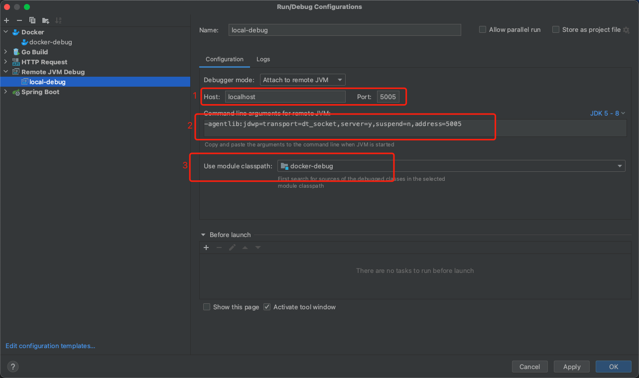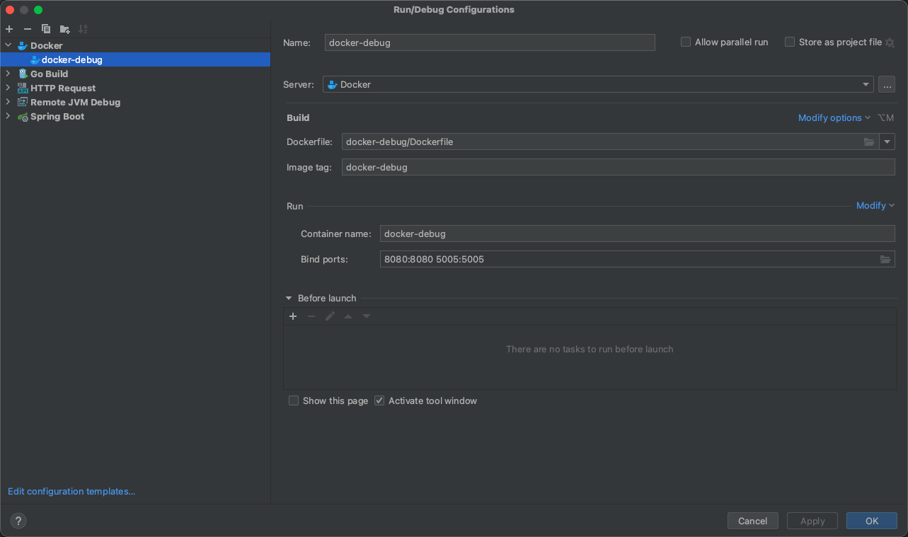 ENTRYPOINT java -agentlib:jdwp=transport=dt_socket,server=y,suspend=n,address=5005 -jar docker-debug-1.0-SNAPSHOT.jar在IDEA中配置Docker环境,配置参考如下,这边需要把服务的端口和Debug的端口都开出来